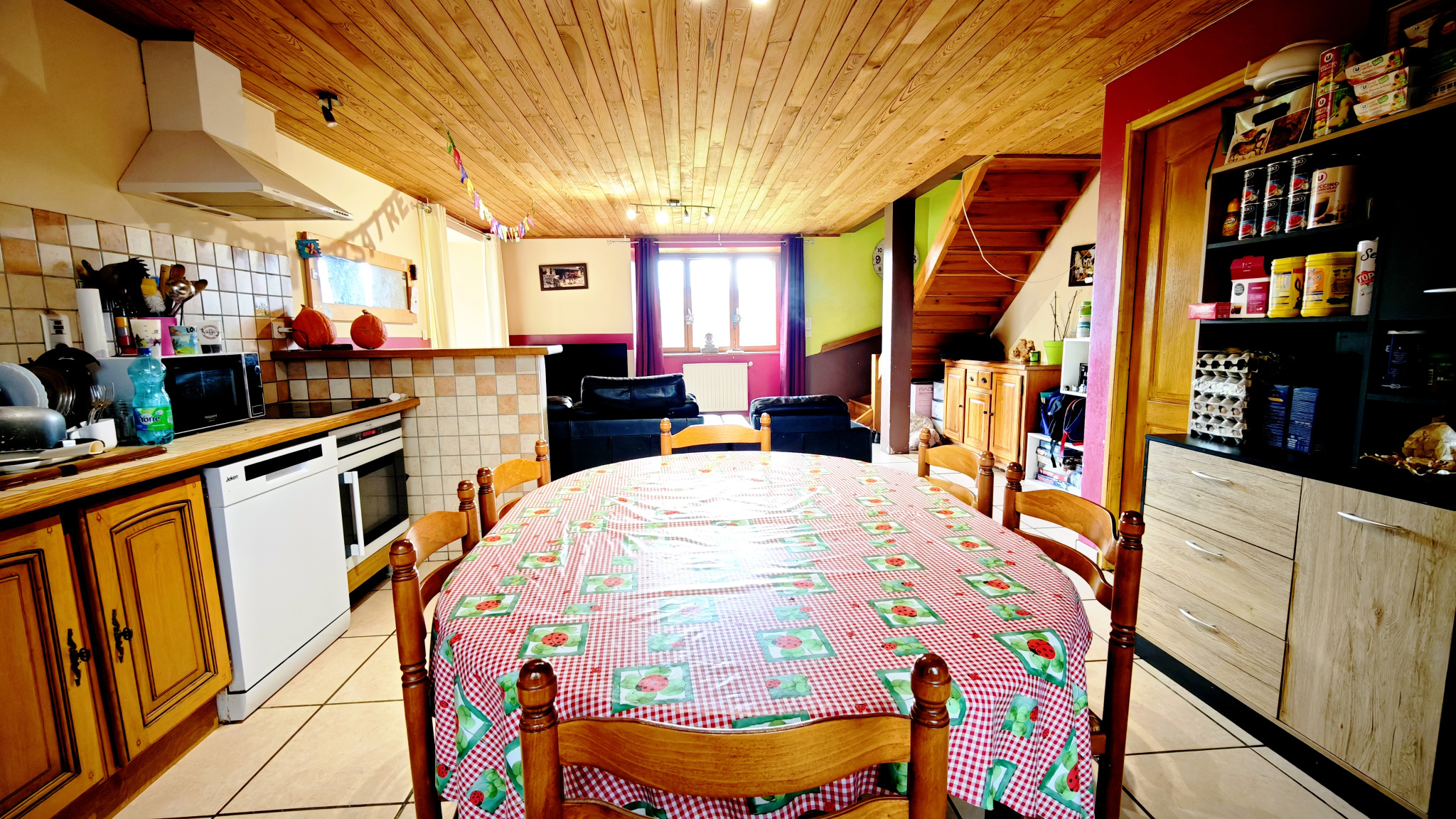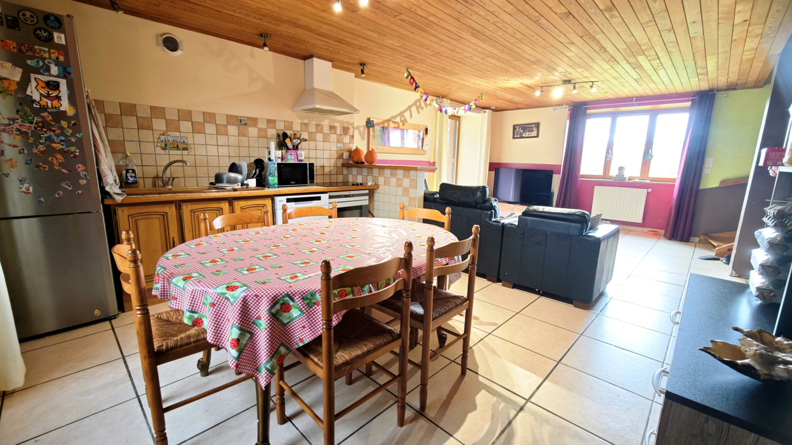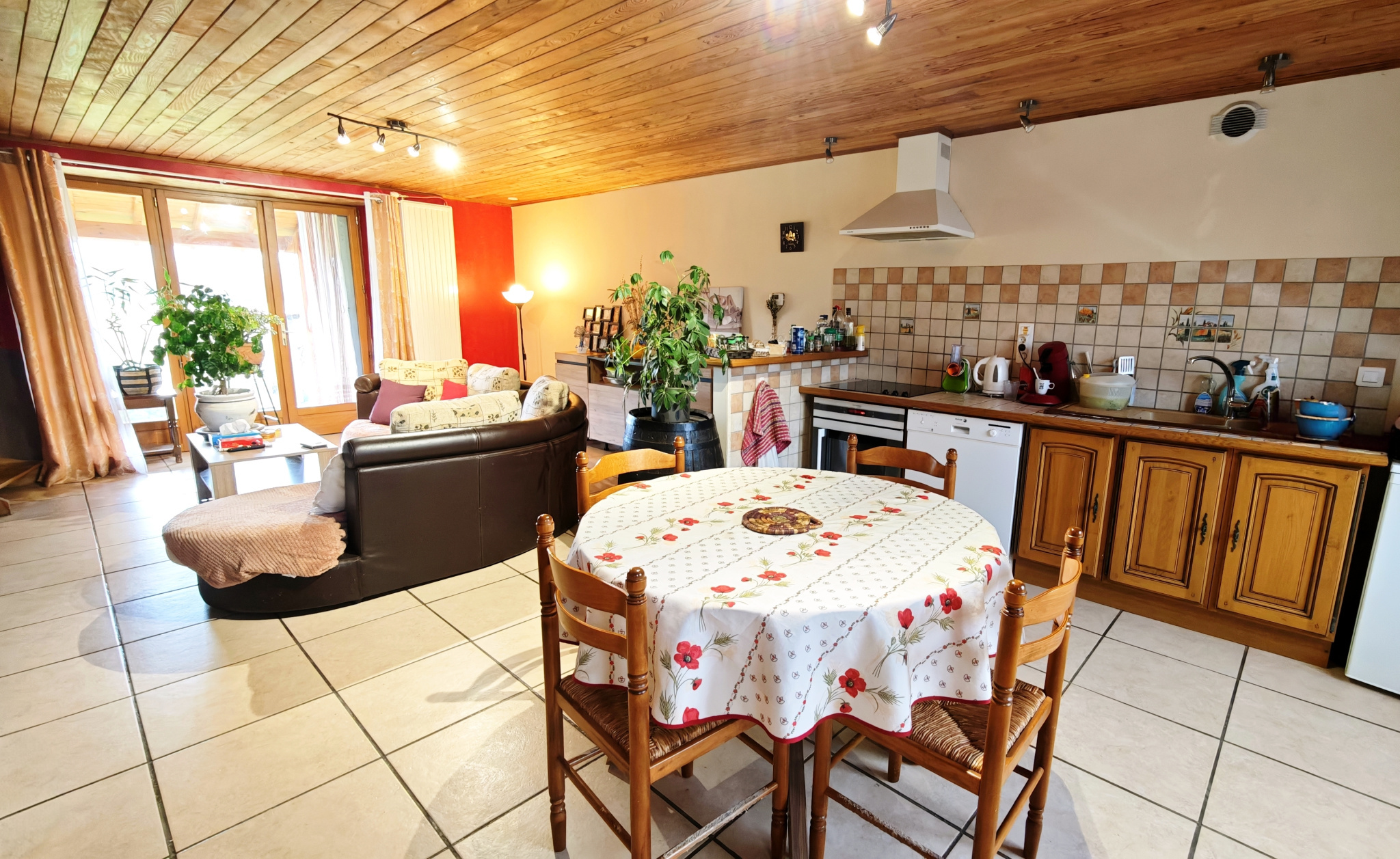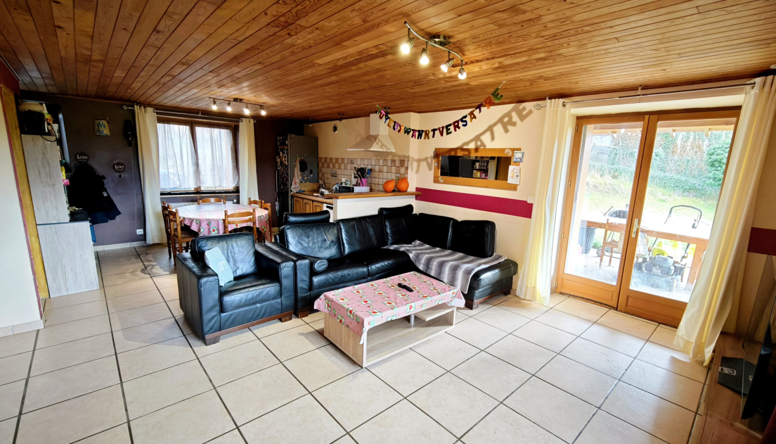 Grand salon séjour ouvert sur la cuisine donnant sur une terrasse avec vue montagne